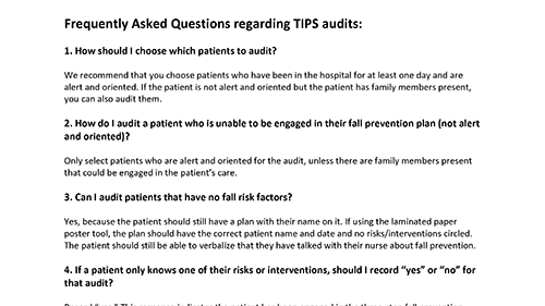 Watch YouTube VideoThis 7-minute video is a recording from a previous Fall TIPS Webinar. The purpose of this webinar is to review the evidence behind Fall TIPS, how to use the Morse Falls Scale to conduct a fall risk assessment, and the Fall TIPS auditing process.